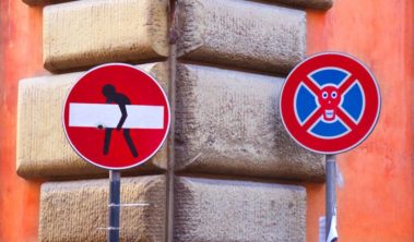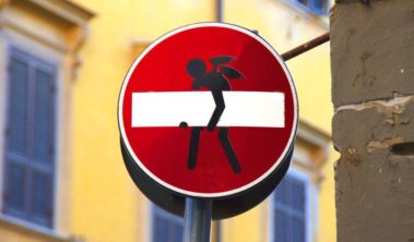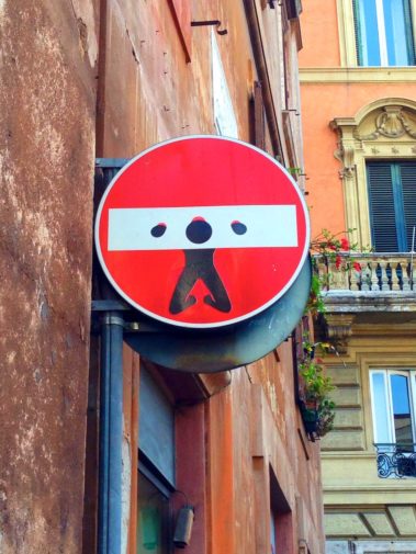 Toutefois, tous ne perçoivent pas l’art de la même manière et nombreux sont ceux qui voit dans le geste de Clet une dégradation du bien public. En 2012, une amende plutôt conséquente lui fut assignée par la police municipale de Pistoia près de Florence, après avoir été pris en flagrant délit de collage ! A Rome, sa liberté d’expression fut également limitée, ses interventions ayant parfois été censurées, notamment celles ayant pour thème la religion. Il est vrai que certains panneaux interpellent plus que d’autres. Une voie sans issue convertie en crucifix ou en Pietà, peut effectivement choquer les plus puritains. La religion est un thème récurrent dans l’œuvre de Clet. Les obligations d’aller tout droit à la prochaine intersection sont souvent couronnées d’anges. Dans une ville qui fut longtemps la capitale des territoires pontificaux et qui accueille aujourd’hui le Vatican, on ne plaisante pas avec la religion.