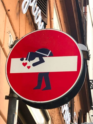 Au cours de mes visites guidées, nombreux sont mes clients qui tentent en vain d’éviter un panneau sur leurs photos. Aujourd’hui, ils photographient presque autant les œuvres de Clet que les statues et fontaines du Bernin ! La réussite de cet artiste tient dans cette phrase ! Le pari de Clet est donc gagné : « Rendre le panneau artistique pour qu’il ne soit plus une erreur dans le paysage d’une ville ».