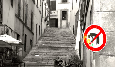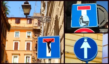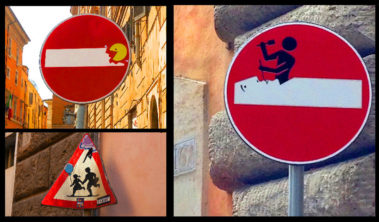 Depuis quelques années, Clet envahit les rues de Rome, mais aussi celles des grandes villes européennes, comme Londres, Paris, Barcelone, Berlin mais aussi Florence, en détournant les panneaux signalétiques de leurs fonctions premières. Les panneaux aux messages universels, permettent à l’artiste de s’adresser à tous, bien au delà des frontières d’un pays.
